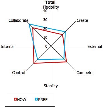 Gambar di atas menunjukkan bahwa culture yang dominan di perusahaan X saat ini cukup seimbang antara collaborate, control dan compete. Sementara harapan (atau preferensi) dari karyawan adalah cenderung ingin dominan di collaborate. Nah… ini ada indikasi masalah. Antara kenyataan dan harapan tidak sesuai. Di sini terjadi indikasi adanya masalah culture fit di dalam organisasi tersebut. Oh ya, cara mendapatkan gambar tersebut ada metode-nya yaitu metode OCAI (Organizational Culture Assessment Instrument).
