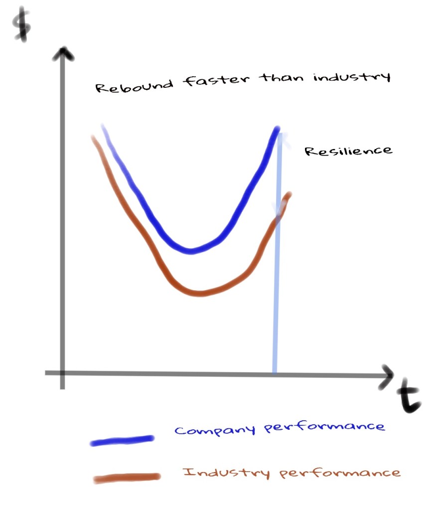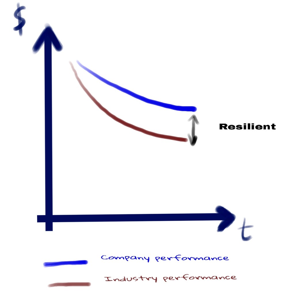 Pandemi yang kita hadapi sekarang, memang merupakan jamu pahit yang harus kita telan bersama. Tapi di balik itu semua, menyimpan harta karun yang berharga. Perusahaan yang bertahan di kondisi krisis seperti ini, atau bahkan dapat mengambil peluang untuk memperkuat competitive advantagenya adalah perusahaan yang tahan banting atau resilient. Apa indikator sebuah perusahaan itu resilient? Menurut pendapat saya sederhana: bagaimana kinerja perusahaan jika dibandingkan dengan industrinya. Ketika turun, perlu berapa lama dapat melakukan rebound dan kembali pada posisi sebelum krisis. Jika perusahaan tersebut memiliki performance yang relatif lebih baik dari industry, sudah jelas perusahaan itu memiliki resilience. Jika terjadi penurunan, kita lihat seberapa cepat perusahaan tersebut rebound, relatif terhadap industri. Itu indikasi perusahaan adalah perusahaan yang tahan banting.