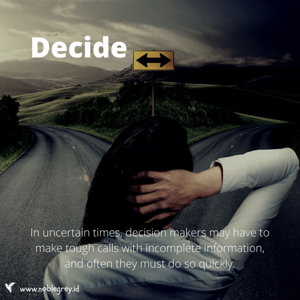 Salah satu fungsi pemimpin adalah -sudah jelas- memutuskan sesuatu. Nah, dengan situasi yang penuh ketidakpastian, seorang pemimpin justru semakin dituntut untuk dapat memutuskan segala sesuatu secara efektif. Dengan informasi yang terbatas, seorang pemimpin yang stratejik harus segera mengambil keputusan sulit dengan segera. Meskipun demikian, seorang pemimpin yang stratejik tidak terburu-buru dalam mengambil keputusan. Mereka bisa menyeimbangkan antara kecepatan dengan ketepatan dalam mengambil keputusan, bisa mempertimbangkan segala kemungkinan dan trade-offs.