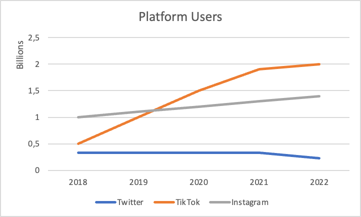 Selama 5 tahun terakhir, pertumbuhan user Twitter terlihat stagnan bahkan cenderung menurun. Bandingkan dengan Instagram bahkan Tiktok. Lalu apa yang dilihat Elon Musk dari Twitter?
