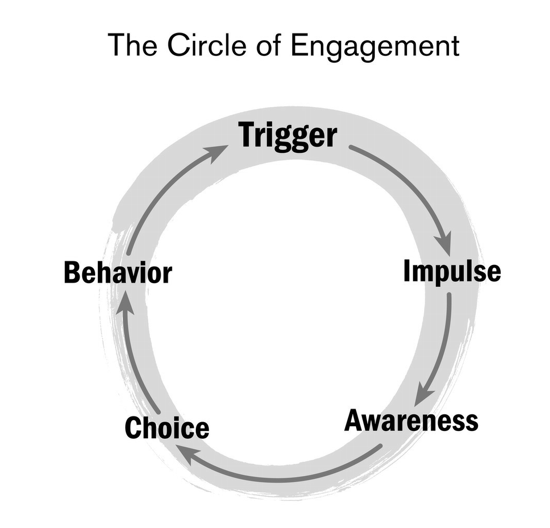 “The Circle of Engagement” di sini adalah suatu konsep yang menggambarkan alur psikologis yang terjadi saat seseorang terlibat dalam tindakan atau perilaku tertentu. Konsep ini terdiri dari lima tahap: trigger (pemicu), impulse (dorongan), awareness (kesadaran), choice (pilihan), dan behavior (perilaku).