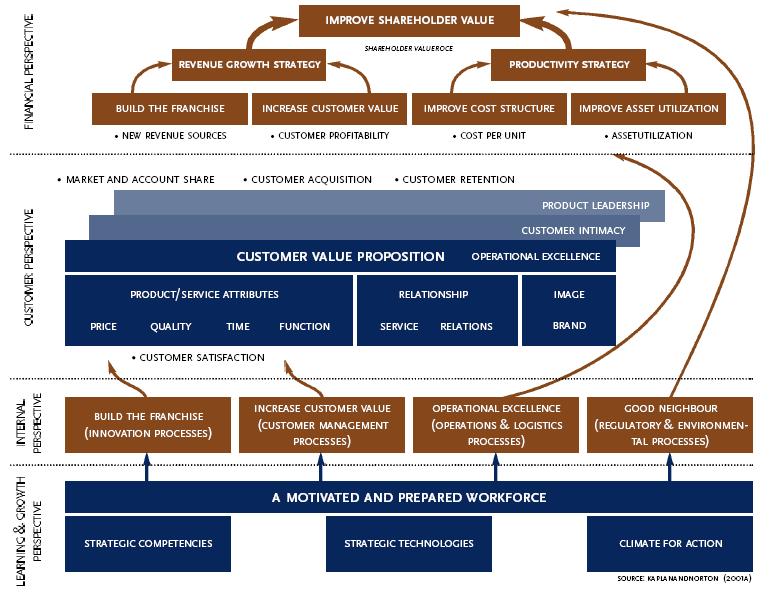- Menerjemahkan strategi ke dalam istilah operasional, yaitu melalui strategy maps dan balanced scorecard. Strategy maps merupakan gambaran strategi perusahaan yang terdiri atas sasaran strategis untuk masing-masing perspektif, kemudian digambarkan hubungan sebab akibat di antara sasaran-sasaran tersebut. Template strategy maps dapat digambarkan sebagai berikut: