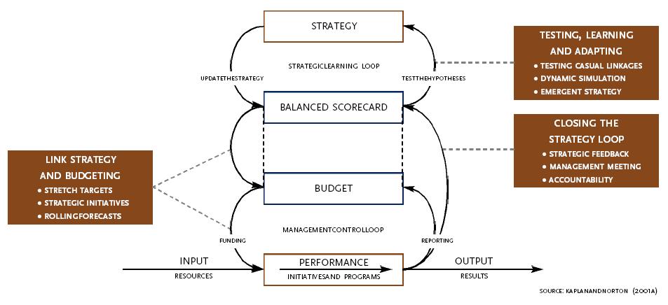 - Membuat strategi menjadi proses yang berkesinambungan. Strategi merupakan proses yang harus berkesinambungan dalam organisasi. Hal ini terkait dengan proses perencanaan, budget, serta feedback dan pembelajaran (learning). Prinsip ini berkaitan dengan proses implementasi strategi dan evaluasi pada manajemen stratejik. Budget yang dulunya merupakan pusat dari manajemen dan pengukuran kinerja ternyata hanya mampu mengatur proses operasi perusahaan pada jangka pendek. Sementara proses mengelola strategi (managing strategy) sulit dilakukan secara efektif dengan menggunakan budget. Sementara strategi perlu dikelola karena berkaitan dengan masa depan perusahaan. Untuk itu, BSC dapat menjebatani antara budget sebagai bagian dari pengaturan operasi, dengan pengaturan strategi yang digambarkan pada skema sebagai berikut: