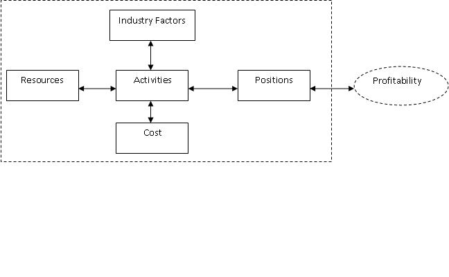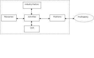 - Aktivitas, bahwa profitabilitas perusahaan tergantung dari aktivitas apa yang dilakukan oleh perusahaan, bagaimana aktivitas ini dilakukan, serta kapan aktivitas ini dilakukan agar perusahaan memiliki posisi yang lebih baik relatif terhadap pesaing. Di sini aktivitas merupakan ”pusat” dari komponen-komponen lainnya, karena komponen lain harus didukung oleh aktivitas yang seuai (fit).