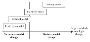 Model bisnis secara natural bersifat statis dan hanyalah merupakan snapshot dari kondisi saat ini (Osterwalder, 2004, p. 36). Agar model bisnis dapat menghadapi pasar persaingan yang hypercompetitive, maka perusahaan harus memiliki bisnis model yang flexible. Linder dan Cantrell (2000) memiliki 4 model perubahan model bisnis, yaitu: realization model, renewal model, extension model, dan journey model. Realization model berfokus pada perubahan kecil pada model bisnisnya untuk memaksimasi potensi yang dimilikinya. Sedangkan renewal model dicirikan oleh revitaliasi secara konsisten pada produk atau jasa, merek, struktur biaya, serta teknologinya. Dengan demikian, perusahaan akan meningkatkan kemampuan intinya (core skill) untuk menciptakan posisi baru. Model perubahan ini sering kali melibatkan serangan terhadap pasar baru dan format retail yang baru. Extention model memperluas bisnis dengan cara melebarkan model operasinya (operating model) untuk masuk ke pasar baru, fungsi rantai nilai (value chain function), serta lini produk atau service yang baru. Model ini sering dicirikan oleh adanya integrasi vertikal (backward dan forward) maupun horizontal. Sedangkan pada journey model perusahaan benar-benar merubah model bisnisnya secara keseluruhan. Model tersebut digambarkan dalam gambar sebagai berikut: